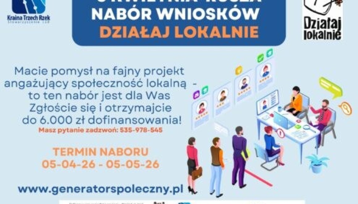 LGD Kraina Trzech Rzek informuje o trwającym naborze wniosków w ramach programu „Działaj Lokalnie”. Celem programu jest wsparcie oddolnych inicjatyw mieszkańców, które przyczyniają się do rozwoju lokalnych społeczności. To doskonała okazja, aby aktywizować mieszkańców oraz wspierać ciekawe i wartościowe projekty społeczne. Pragniemy podkreślić, że nawet niewielkie środki finansowe mogą stać się impulsem do realizacji dużych […]